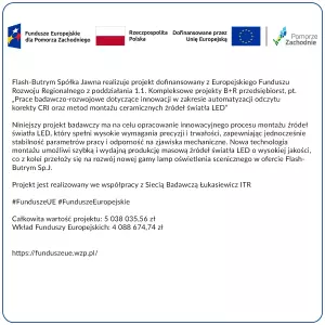 Flash-Butrym Spółka Jawna is implementing a project co-financed by the European Regional Development Fund under Sub-measure 1.1. Comprehensive R&D projects of enterprises, entitled "Research and development work on innovations in the field of CRI correction reading automation and methods of mounting ceramic LED light sources"