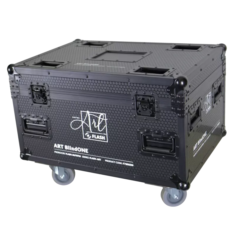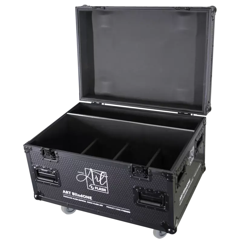 A robust transport box for eight BlindONE devices. Internal compartments ensure safe storage and transport for six devices, along with cables and accessories. The box is equipped with four sturdy locking wheels, comfortable handles for easy portability, and the entire box is reinforced with aluminum profiles and ball-bearing corners, which further secure the structure and protect the surrounding area by eliminating sharp edges. It opens on one side, and the appropriate tilt angle prevents the top of the box from falling, providing easy and convenient access to stored items. The compartmented interior is lined with soft technical foam, which effectively protects stored items from damage.