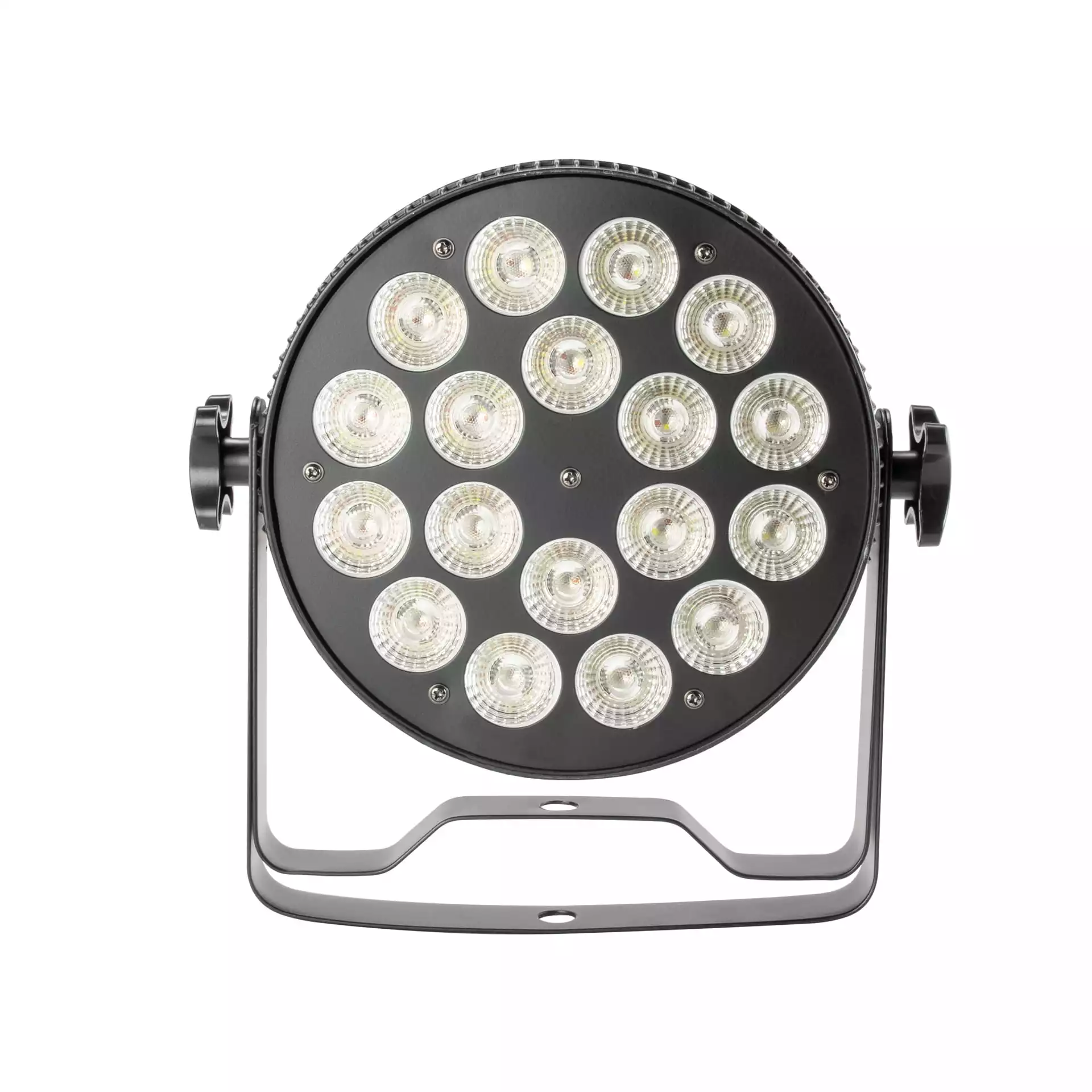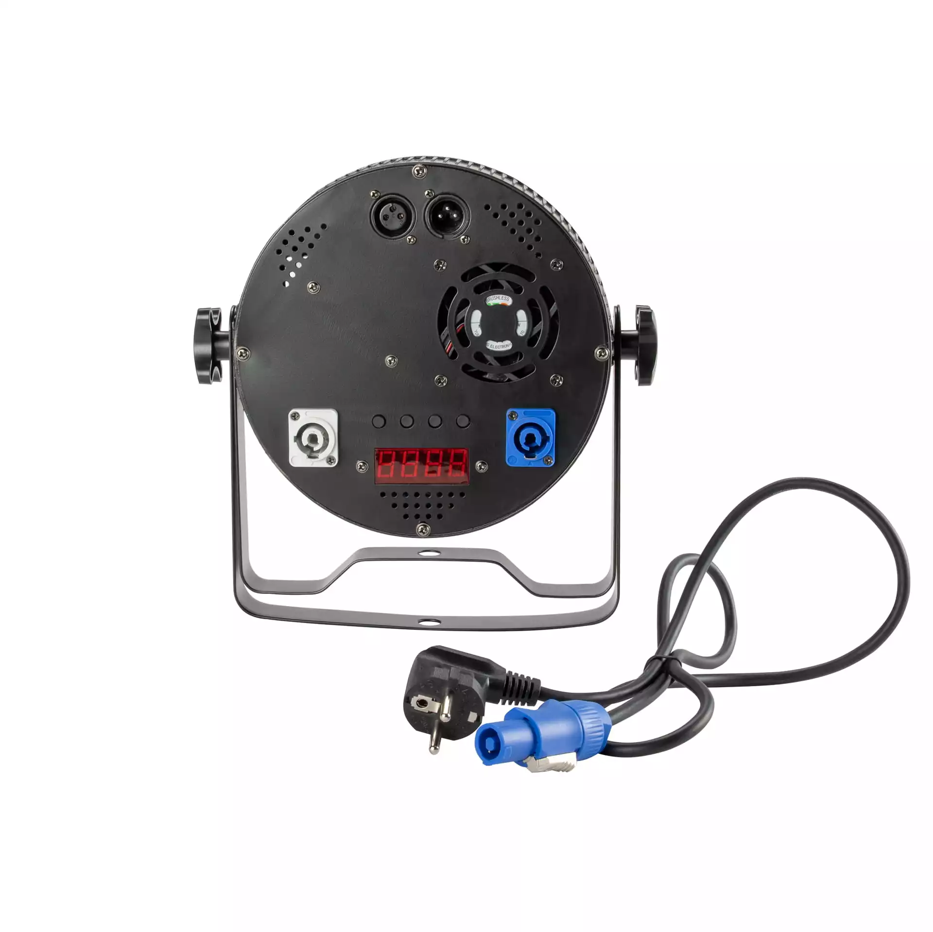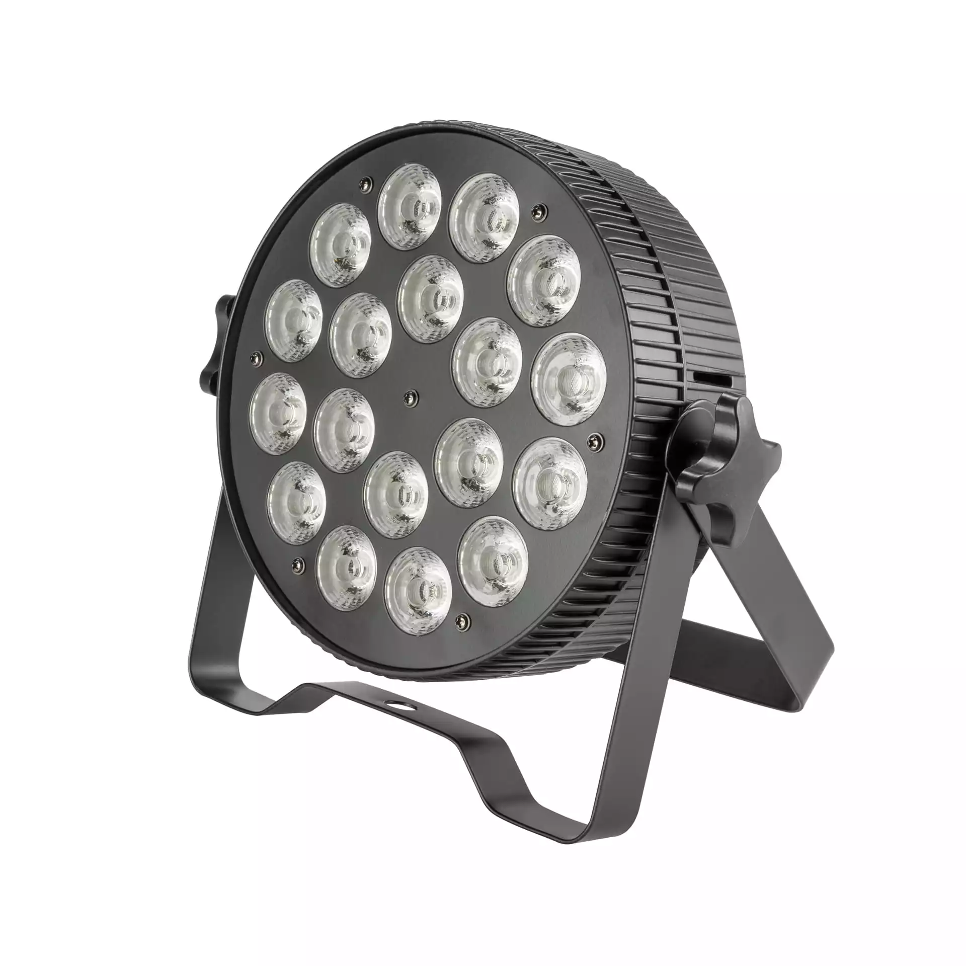 The PAR64 LED 1812 +AUV FLAT spotlight is equipped with eighteen RGBW-AUV diodes with a power of 12W each. Unique design, narrow aluminum housing, and many control modes make this device a perfect tool for people who value simplicity and reliability. Additionally, the reflector is equipped with a universal double handle, which makes it very easy to hang it or simply place it on the ground.