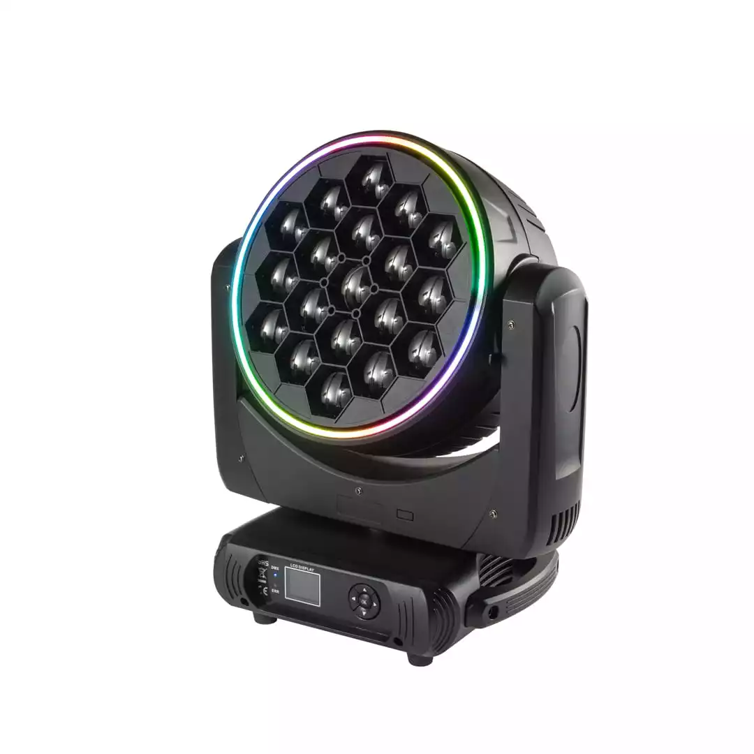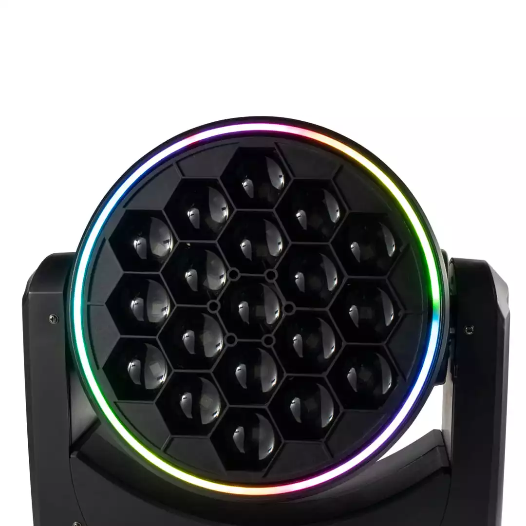 WASH-BE LED 1940 ECO está equipado con un anillo RGB y 19 LED RGBW con una potencia de 40W cada uno, lo que garantiza un control suave del brillo con una mezcla perfecta de colores. Rápido tiempo de respuesta de giro/inclinación, ZOOM motorizado (5-60°), forma, funciones de efectos, interfaz de usuario intuitiva, siete modos y múltiples modos de funcionamiento. Todo esto le permite lograr efectos fantásticos en diversos eventos. Un dispositivo compacto, cuidadosamente diseñado y colocado en una sólida carcasa de ABS con refrigeración activa, hace de este dispositivo una útil herramienta de trabajo que ofrece grandes posibilidades.