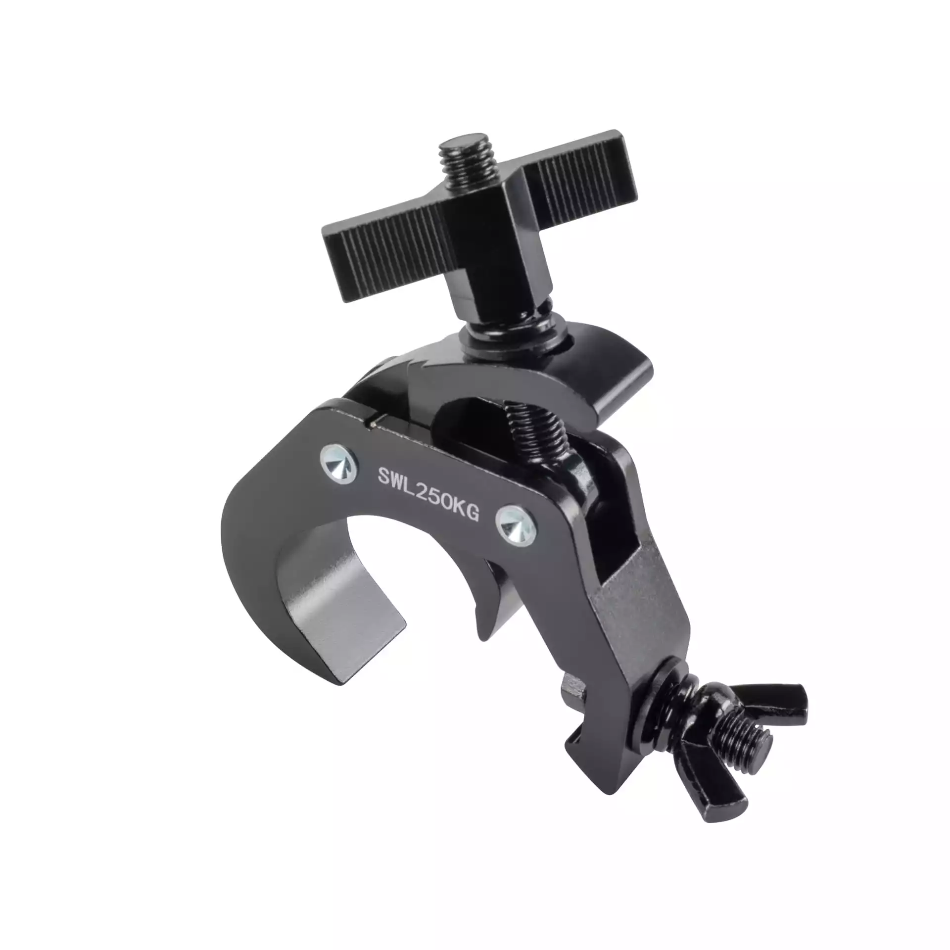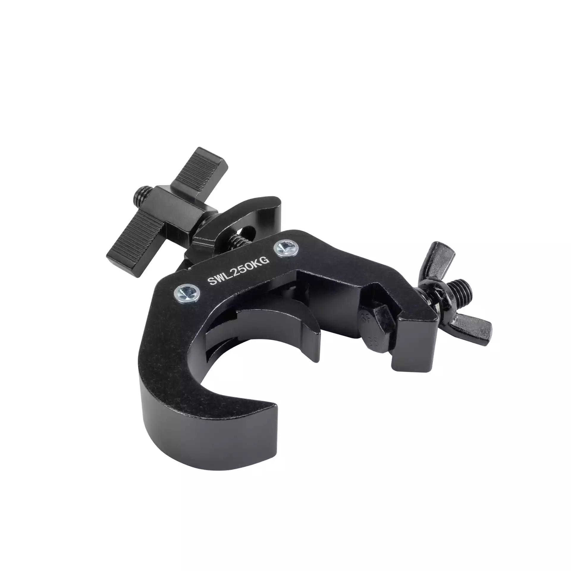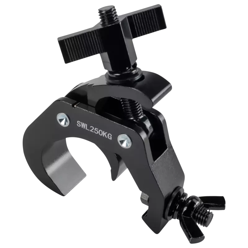 Profesjonalny uchwyt (hak) szybko montażowy "quick trigger", umożliwiający przymocowanie wszelkiego rodzaju urządzeń estradowych, oświetleniowych, do rurowych konstrukcjach aluminiowych o średnicy 42-60 mm. Przykręcony bezpośrednio do urządzenia hak, umożliwia szybki montaż, dzięki zastosowaniu wygodnej śrubie motylkowej.Solidna konstrukcja sprawia że hak wytrzymuje obciążenie do 250 kg.