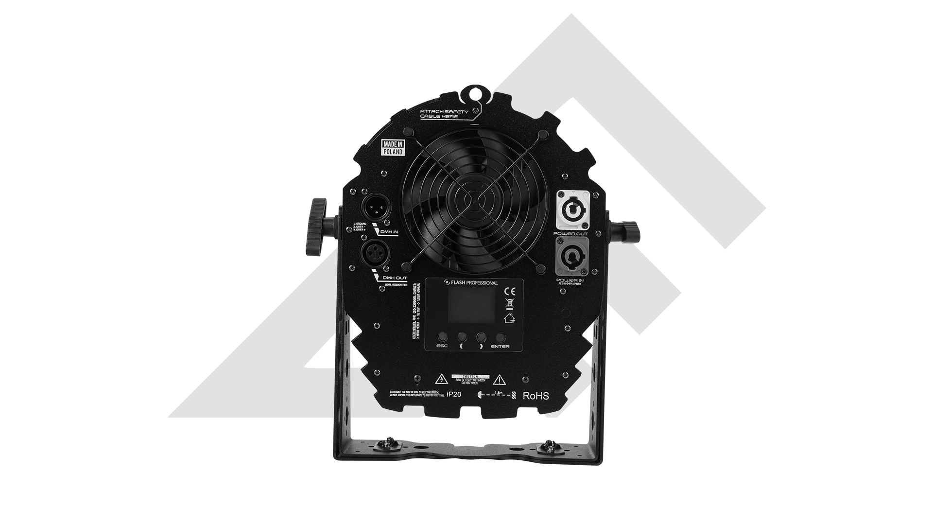 Reflektor wyposażony został w cztery mocne diody RGBW o łącznej mocy 120W. Wszystkie z nich zapewniają mocne światło o dalekim zasięgu, emitującym praktycznie nieograniczoną kombinację niezwykle jasnych barw.Wyjątkowe wzornictwo, wysoka jakość wykonania oraz materiały zapewniające dużą trwałość czynią to urządzenie doskonałym narzędziem zarówno dla wymagających użytkowników jak i osób ceniących prostotę i niezawodność. Reflektor jest wyposażony w uniwersalny podwójny uchwyt, dzięki któremu bardzo łatwo go zawiesić lub po prostu postawić na ziemi.