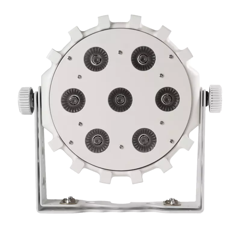 Biały Reflektor LED PAR Slim z siedmioma diodami o łącznej mocy 70W teraz w wersji z bezprzewodowym interfejsem DMX, IR control, oraz kącie świecenia 15°. Brak konieczności łączenia reflektorów przewodami z sygnałem sterującym otwiera przed użytkownikiem niezliczone możliwości wykorzystania tego urządzenia w miejscach, gdzie instalacja oświetlenia jest znacznie utrudniona lub wymaga szybkiego tempa pracy. Tam, gdzie warunki uniemożliwiają prowadzenie kabli, bezprzewodowy interfejs DMX pozwala na utrzymanie łączności i wykorzystanie pełnego spektrum możliwości reflektora dostępnego jedynie podczas sterowania przez DMX.